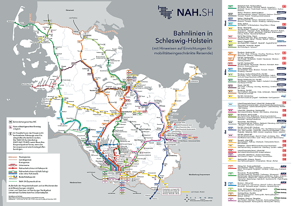 Welche Bahnlinien gibt es in Schleswig-Holstein? Wie sieht die Anbindung der verschiedenen Städte und Gemeinden aus? Welche Station ist barrierefrei erreichbar? Wo ist welches Verkehrsunternehmen im Einsatz? All diese Informationen finden Sie auf der Bahnlinienkarte für Schleswig-Holstein.