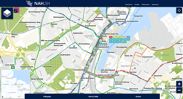 Wo fahren welche Bahn- und Buslinien und wo befindet sich die nächstegelegene Haltestelle? Im interaktiven Liniennetzplan der NAH.SH finden Sie eine Übersicht der Linien und Haltestellen des Nahverkehrs in Schleswig-Holstein. Eine Fahrplanauskunft ist ebenfalls integriert.